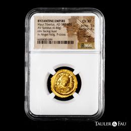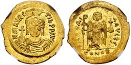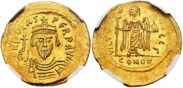 Mauricius Tiberius. Solidus. 583-602 AD. Constantinople. (MIBE-6). (Doc-5g). (Sear-478). Anv.: O N MAVRC TIЬ P P AVCC, helmeted and cuirassed bust facing, wearing paludamentum, holding globus cruciger. Rev.: VICTORIA AVCC S, angel standing facing, holding long staff surmounted by staurogram and globus cruciger; CONOB in exergue. . 4,44 g. Slabbed by NGC as Ch XF, Strike 5/5, Surface 4/5. Clipped. Original luster. Est...600,00.