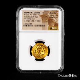 Phocas. Solidus. 604-607 AD. Constantinople. (MIBE-7). (Doc-5f). (Sear-618). Anv.: O N FOCAS PЄRP AVC, draped and cuirassed bust facing, wearing crown without pendilia, holding globus cruciger. Rev.: VICTORIA AVCC S, angel standing facing, holding staff surmounted by staurogram and globus cruciger; CONOB in exergue. . 4,50 g. Slabbed by NGC as Ch AU, Strike 4/5, Surface 3/5. Traces of luster. Est...600,00.