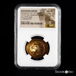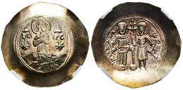 Michael VII Ducas. Histamenon nomisma. 1071-1078 AD. Constantinople. (Doc-2c). (SB-1868). Anv.: Bust of Christ Pantokrator facing; in fields, IC - XC. Rev.: MIX AHΛ RACIΛ OΔ Crowned bust of Michael facing, wearing loros and holding labarum in his right hand and globus cruciger in his left. . 4,30 g. Slabbed by NGC as Ch VF, Strike 4/5, Surface 4/5, clipped. Est...400,00.