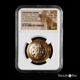 Manuel I Comnenus. Aspron Trachy. 1160-1164 AD. Constantinople. (Doc-4c). (Sear-159). Anv.: Christ Pantokrator standing facing on low daïs; IC-XC and stars across fields. Rev.: Manuel and St. Theodore standing facing, each holding a sword and patriarchal cross set on globus between them, two pellets on shaft of patriarchal cross; MANᏌHΛ to left, O ΘЄΟΔѠΡOC to right. . 4,37 g. Slabbed by NGC as MS, strike 5/5, surface 4/5. Ex Heritage Auctions 232317 (26/04/2023), lot 64239. Est...500,00.