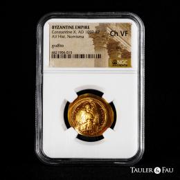 Constantine X Ducas. Histamenon nomisma. 1059-1067 AD. Constantinople. (Doc-1b). (Sear-1847). Anv.: + IҺ(retrograde)I XIΓ RЄX RЄINANTҺIM, Christ Pantokrator enthroned facing. Rev.: + KѠN RAC Λ O ΔOVKAC, Constantine, bearded, standing facing on footstool, wearing crown with pendilia, saccos and loros, and holding labarum with pellet on shaft and globus cruciger. . Slabbed by NGC as Ch VF. Bent. Graffiti. Est...450,00.