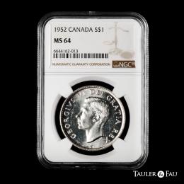 Canada. George VI. 1 dollar. 1952. (Km-46). Ag. Plenty of original luster. Slabbed by NGC as MS 64. Est...80,00.