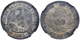 Chile. 1 peso. 1885. Santiago. (Km-142.1). Ag. Attractive patina. Slabbed by NGC as MS 61. Est...200,00.
