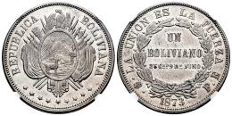 Bolivia. 1 boliviano. 1873. Potosi. FE. (Km-160.1). Ag. Slabbed by NGC as AU 58. Est...120,00.