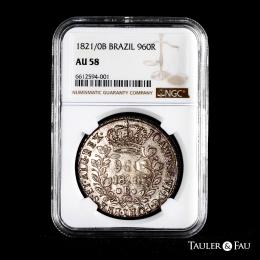 Brazil. D. Joao VI (1816-1826). 960 reis. 1821/0. Bahía. B. (Km-326.2). Ag. Clear overdate. Delicate patina. Struck over 8 reales. Slabbed by NGC as AU 58. Est...250,00.