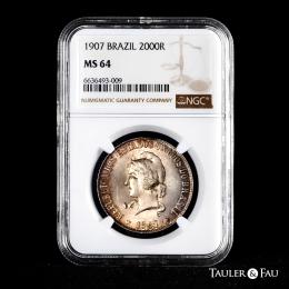 Brazil. 2000 Reis. 1907. Rio de Janeiro. (Km-508). Ag. Original luster. Scarce in this grade. Slabbed by NGC as MS 64. Est...250,00.