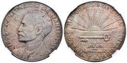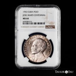 Cuba. 1 peso. 1953. Philadelphia. (Km-29). Ag. Jose Marti centennial. Some luster and nice tone. Slabbed by NGC as MS 64. Est...120,00.