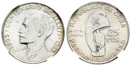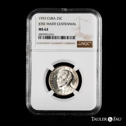 Cuba. 25 centavos. 1953. Philadelphia. (Km-27). Ag. Jose Marti centennial. Original luster. Slabbed by NGC as MS 62. Est...40,00.