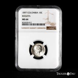 Colombia. 10 centavos. 1897. Bogotá. (Km-188). (Restrepo-373.1). Ag. Plenty of original luster. Slabbed by NGC as MS 64. Only 1 finer specimen in the NGC census. Est...150,00.