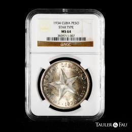 Cuba. 1 peso. 1934. Philadelphia. (Km-15.2). Ag. Plenty luster and shaply struck. Slabbed by NGC as MS 64, Star Type. Est...500,00.