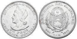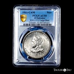 El Salvador. 1 peso. 1911. CAM. (Km-115.2). Ag. Large bust. Slabbed by PCGS as AU 55. Est...250,00.