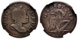 U.S. Coins. Colonial America. Half penny. 1760. Hibernia / Voce Populi. (D&F-570). (Nelson-2). (Zelinka-4/B). Ae. No "P" below the bust. Slabbed by NGC as VF 20 BN. Est...200,00.