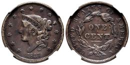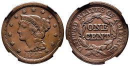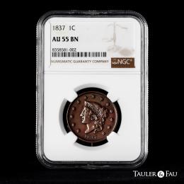 U.S. Coins. Braided Hair Cents. 1 cent. 1837. Philadelphia. (Km-45.2). Ae. Slabbed by NGC as AU 55 BN. NGC-AU. Est...100,00.