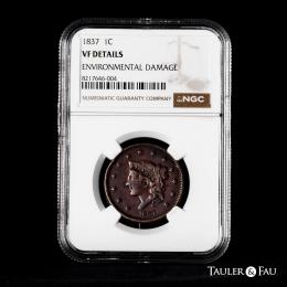 U.S. Coins. Braided Hair Cents. 1 cent. 1837. Philadelphia. (Km-45.2). Ae. Slabbed by NGC as VF Details. Environmental damage. NGC-VF. Est...70,00.