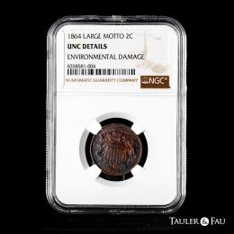 U.S. Coins. Two-Cent Pieces. 2 cents. 1864. Philadelphia. Large motto. (Km-94). Ae. Slabbed by NGC as UNC Details. Environmental damage. Est...100,00.