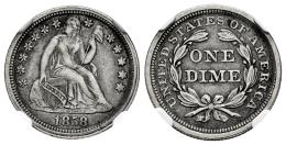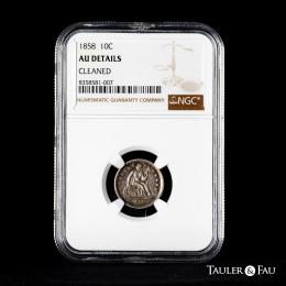U.S. Coins. Seated Liberty Dime. 1 dime. 1858. Philadelphia. (Km-A63.2). Ag. Slabbed by NGC as AU Details, Cleaned. NGC-AU. Est...70,00.