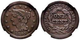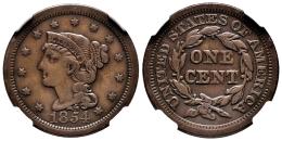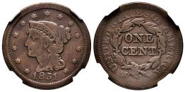 U.S. Coins. Braided Hair Cents. 1 cent. 1851. Philadelphia. (Km-67). Ae. Slabbed by NGC as F 12 BN. Est...60,00.