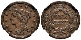 U.S. Coins. Braided Hair Cents. 1 cent. 1856 (Slanted 5). Philadelphia. (Km-67). Ae. Slabbed by NGC as XF Details. Rim Damage. Est...70,00.