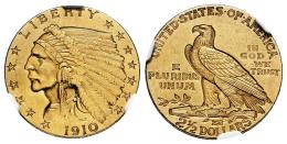 U.S. Coins. Indian Quarter Eagles. 2 1/2 dollars. 1910. Philadelphia. (Km-128). (Fr-120). Au. Slabbed by NGC as AU Details, Cleaned. Est...600,00.