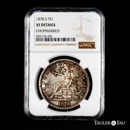United States. Trade dollar. 1878. San Francisco. S. (Km-108 var.). Ag. 27,23 g. Chopmarked. Slabbed by NGC as XF DETAILS, CHOPMARKED. Est...180,00.
