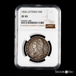 U.S. Coins. Capped Bust. Half dollar. 1836/1336. Philadelphia. (Km-37 var.). (Overton-108a). Ag. Slabbed by NGC as XF 45. A variety with the corrected date of 1836 over 1336, which was overlooked by NGC. Rare. Est...200,00.