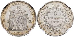 France. 5 francs. 1873. Paris. A. (Km-820.1). (Gad-745a). Ag. Original luster. Slabbed by NGC as MS 63. Est...100,00.