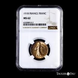 France. 1 franc. 1918. Paris. (Km-844.1). (Schön-187). Ag. Slabbed by NGC as MS 62. Est...70,00.
