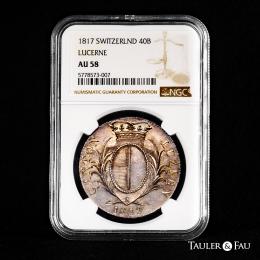 Switzerland. 40 batzen. 1817. Lucern. (Km-113). (HMZ-2-669b). Ag. Attractive specimen. Slabbed by NGC as AU 58, only three finer specimens known in the NGC census. NGC-AU. Est...500,00.