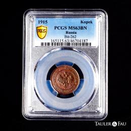 Russia. Nicholas II (1894-1917). 1 kopek. 1915. Saint Petesburg. (Km-Y# 9.3). (Bitkin-262). Ae. Traces of luster. Slabbed by PCGS as MS 63 BN. Est...70,00.