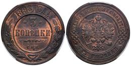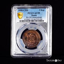 Russia. Nicholas II (1894-1917). 3 kopeks. 1898. Birmingham. CПБ. (Km-Y#11.2). (Bitkin-285). Ae. Slabbed by PCGS as AU 55. Est...120,00.