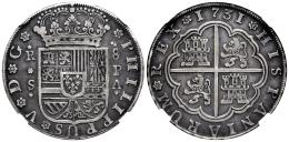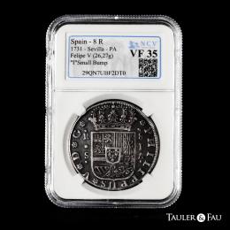 Philip V (1700-1746). 8 reales. 1731. Sevilla. PA. (Cal-1623). Ag. 26,27 g. Vertical assayers´s marks. Delicate patina. Scarce. Slabbed by NCV as VF 35. Ex Áureo & Calicó 338 (13/11/2019), lot 298. Est...600,00.