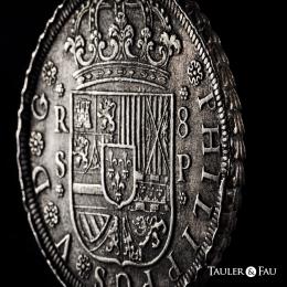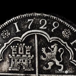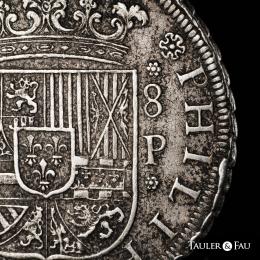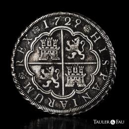 Philip V (1700-1746). 8 reales. 1728. Sevilla. P. (Cal-1618). Ag. 23,48 g. Marine oxidation. Rare. Private purchase from Frank Sedwick in April 1995. Ex José Octavio Busto Collection. Retains the collector’s label. Almost VF. Est...700,00.