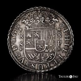 Philip V (1700-1746). 8 reales. 1743. Potosi. C. (Cal-1584 var). Ag. 25,77 g. Valor bajo el cuartelado del anverso. Leves oxidaciones. Pátina oscura. Escasa. Almost VF. Est...350,00.