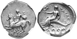 Calabria. Tarentum. Nomos. 281-272 BC. Philon magistrate. (Vlasto-685). (HN Italy-964). (Hgc-1, 815). Anv.: Nude youth on horseback to left, holding shield; EY behind, ΦIΛΩN below. Rev.: Taras astride dolphin to left, holding Nike who crowns him; TAPAΣ behind, waves below. . 7,79 g. Slabbed by NGC as AU, strike 5/5, surface 4/5. Ex Classical Numismatic Group, Keystone 11 (03/03/2023), lot 15. Est...600,00.