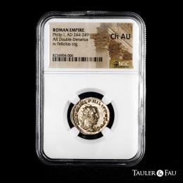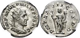 Philip I. Antoninianus. 246 AD. Rome. (Ric-IV 3). (Rsc-124). Anv.: IMP M IVL PHILIPPVS AVG, radiate, draped and cuirassed bust to right. Rev.: P M TR P III COS P P, Felicitas standing facing, head to left, holding long caduceus and cornucopiae. . Encapsulada por NGC como Ch AU. Est...100,00.