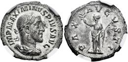 Maximinus I. Denarius. 235-236 AD. Rome. (Ric-IV 12). (Bmcre-68/71). (Rsc-31a). Anv.: IMP MAXIMINVS PIVS AVG, laureate, draped and cuirassed bust to right. Rev.: PAX AVGVSTI, Pax standing facing, head to left, holding branch in raised hand and transverse sceptre. . Slabbed by NGC as XF. Est...200,00.