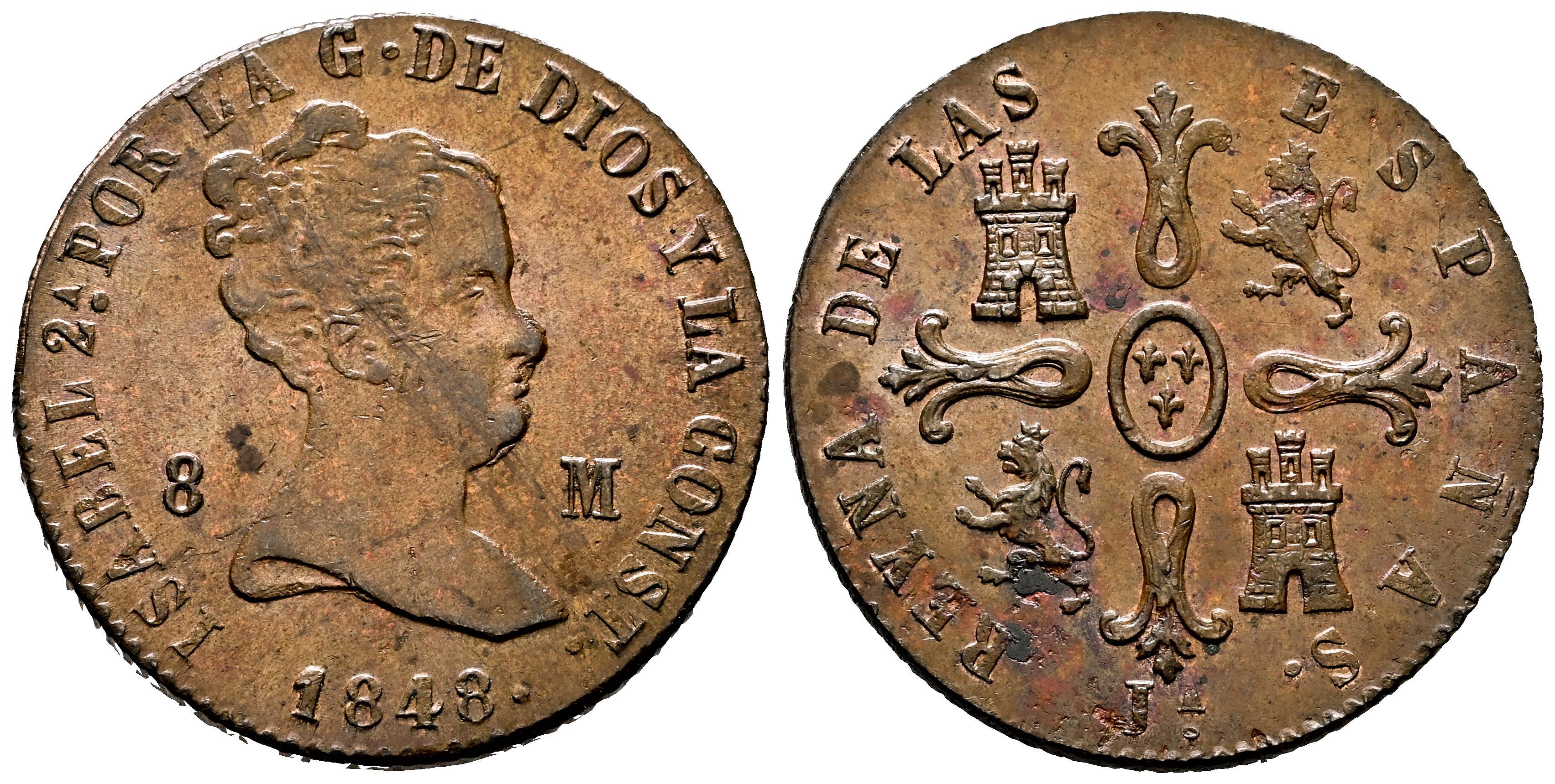 Elizabeth II (1833-1868). 8 maravedis. 1848. Jubia. (Cal-115). Ae. 10,00 g. Impurities but nice. Ex Áureo (19/12/2001), lot 1544. XF/AU. Est...100,00.