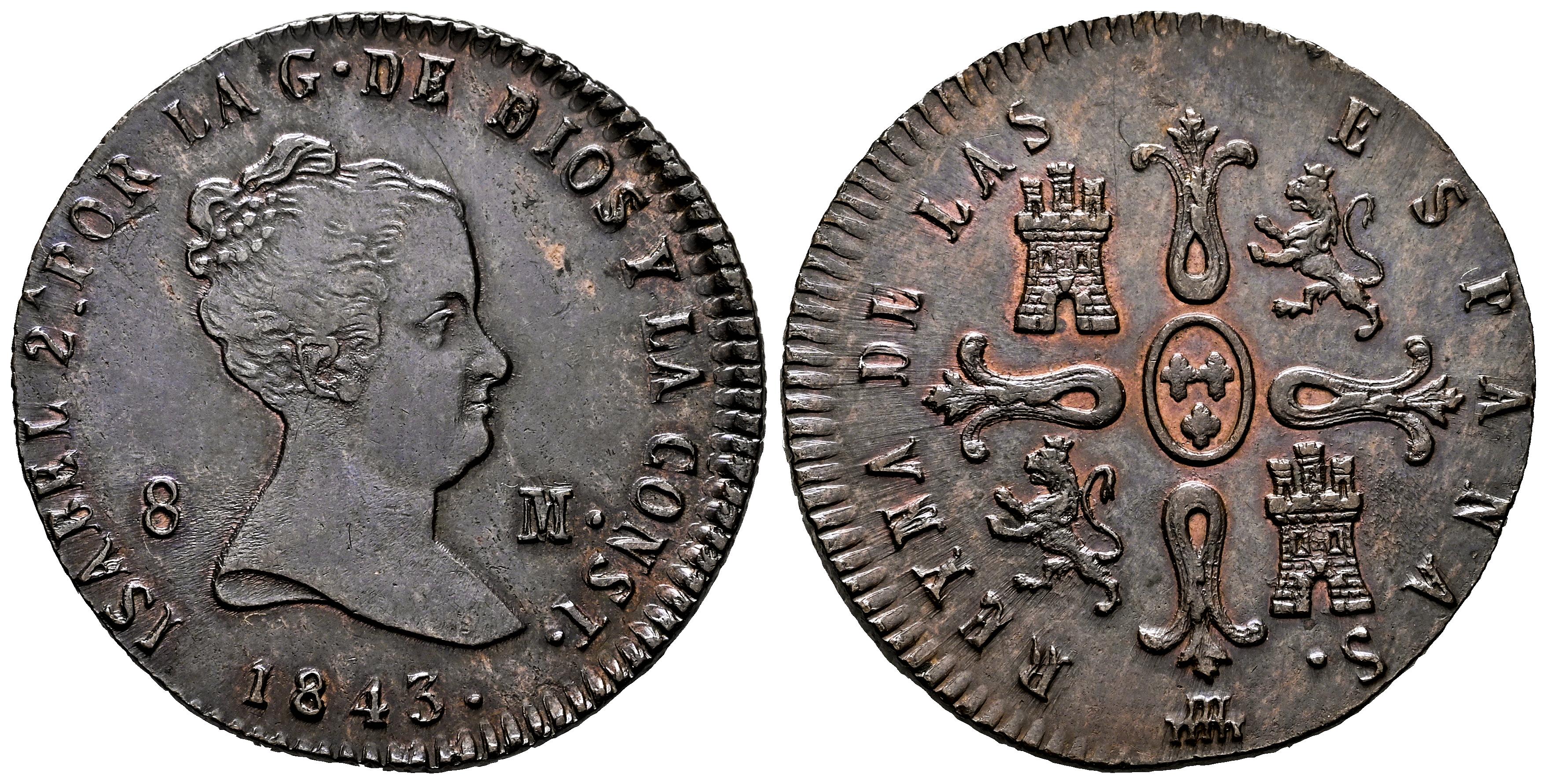 Elizabeth II (1833-1868). 8 maravedis. 1843. Segovia. (Cal-130). Ae. 10,07 g. Beautiful specimen. Almost XF. Est...90,00.