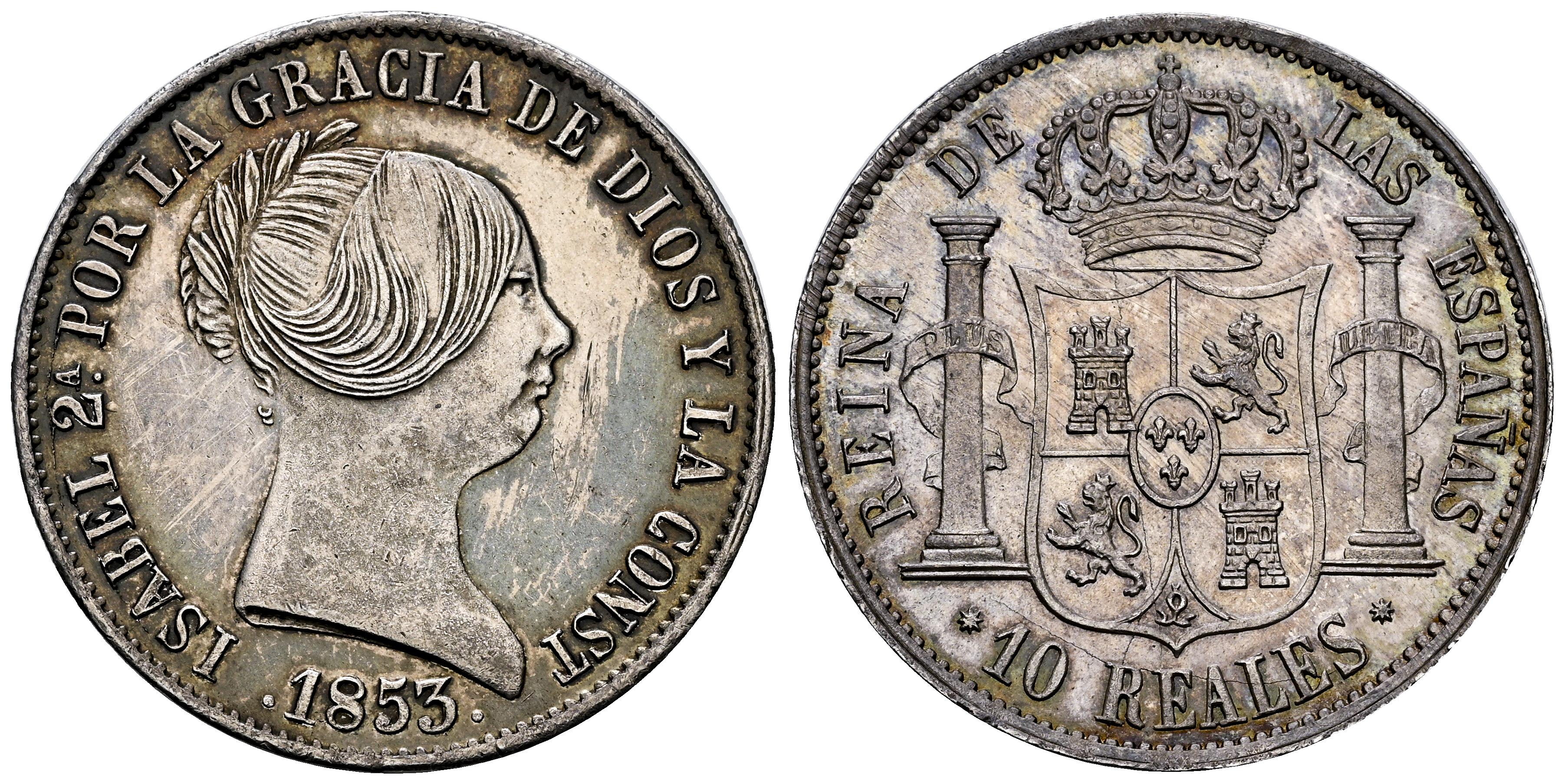 Elizabeth II (1833-1868). 10 reales. 1853. Barcelona. (Cal-508). Ag. 13,12 g. Nice reverse patina. Surface hailines on the obverse. Escasa. Ex Colección O' Donnell, Áureo (19/11/2003), lot 300. Almost XF/XF. Est...300,00.