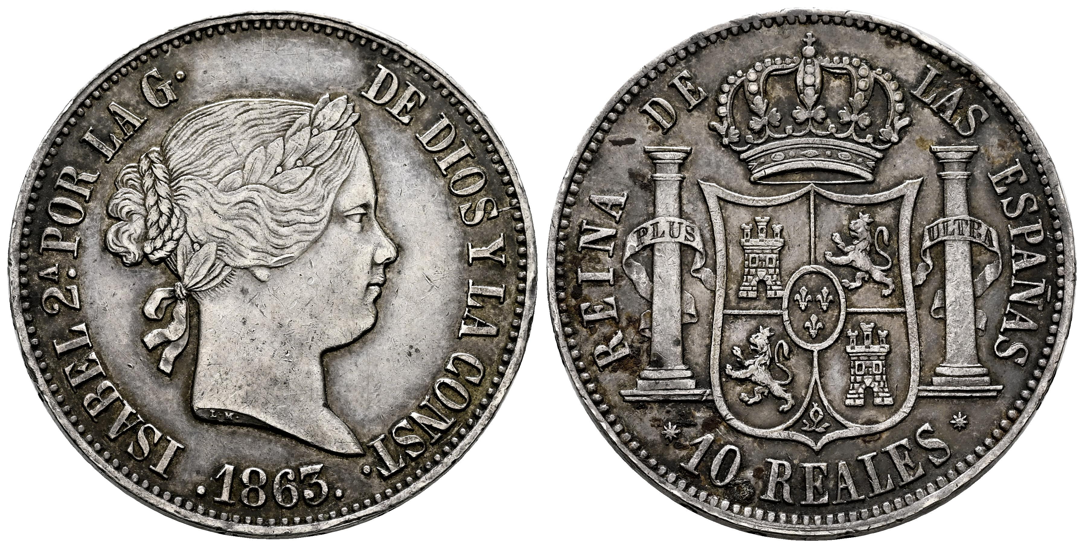 Elizabeth II (1833-1868). 10 reales. 1863. Barcelona. (Cal-518). Ag. 12,96 g. Slight patina. Extremely rare. Almost XF. Est...900,00.