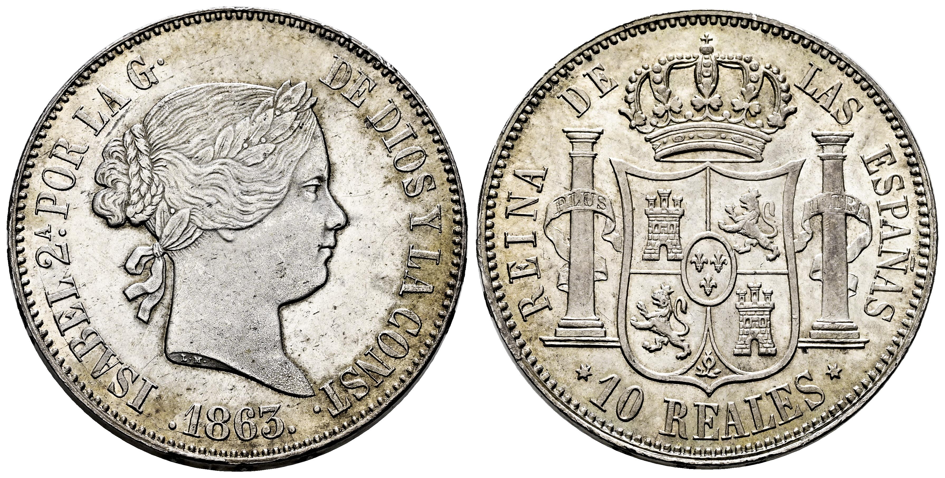 Elizabeth II (1833-1868). 10 reales. 1863. Madrid. (Cal-540). Ae. 13,20 g. Original luster. Slight patina. Scarce. XF. Est...200,00.