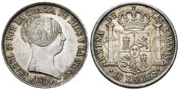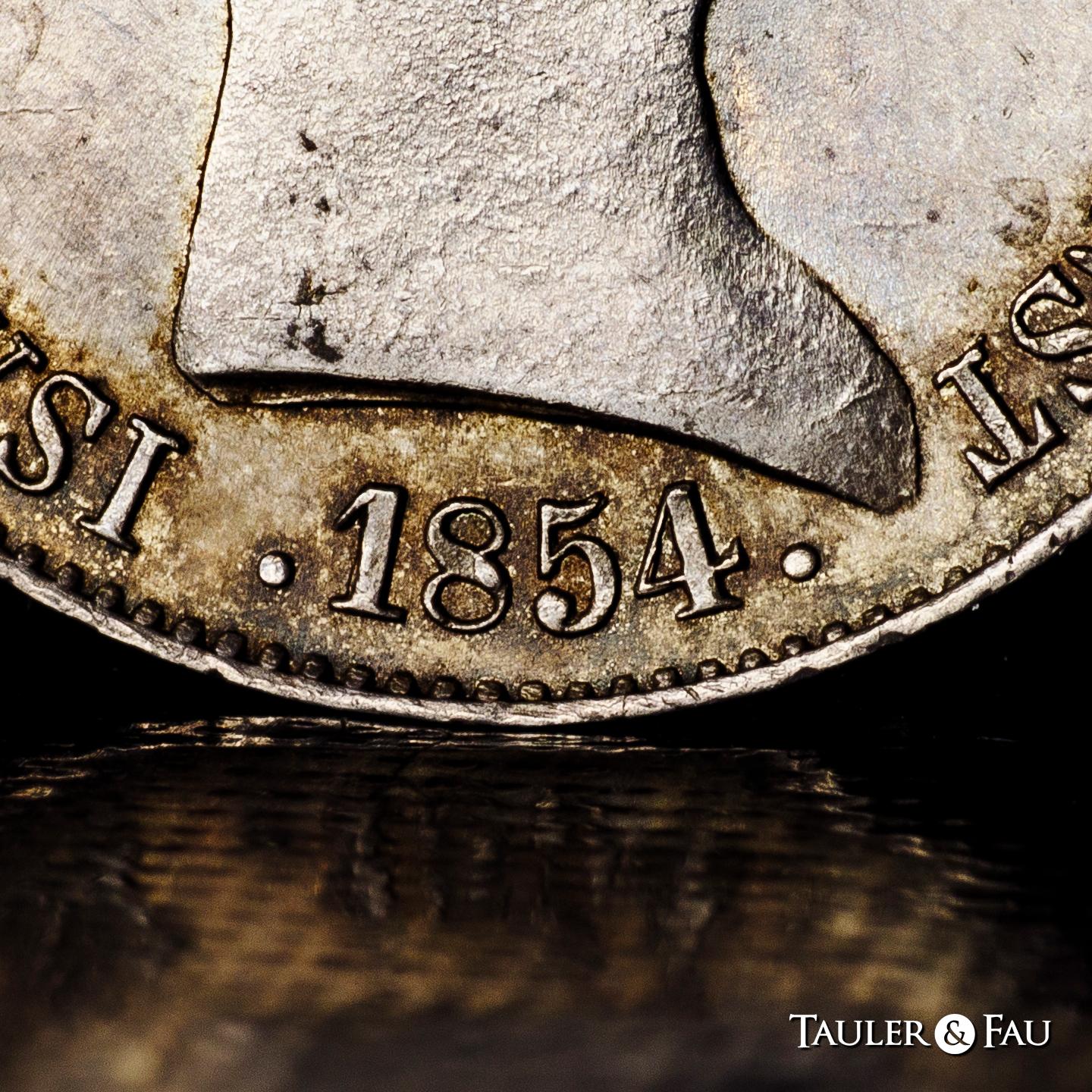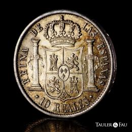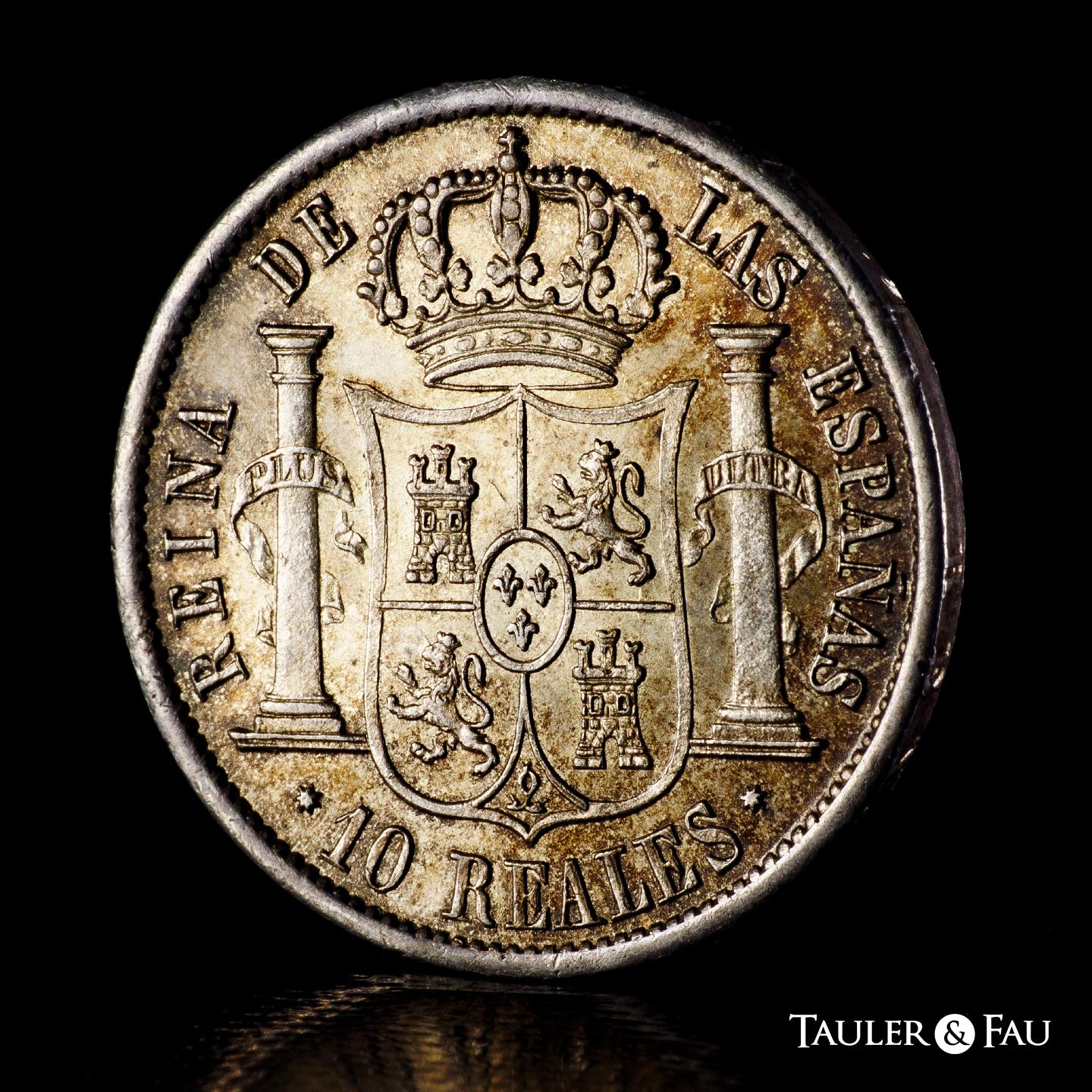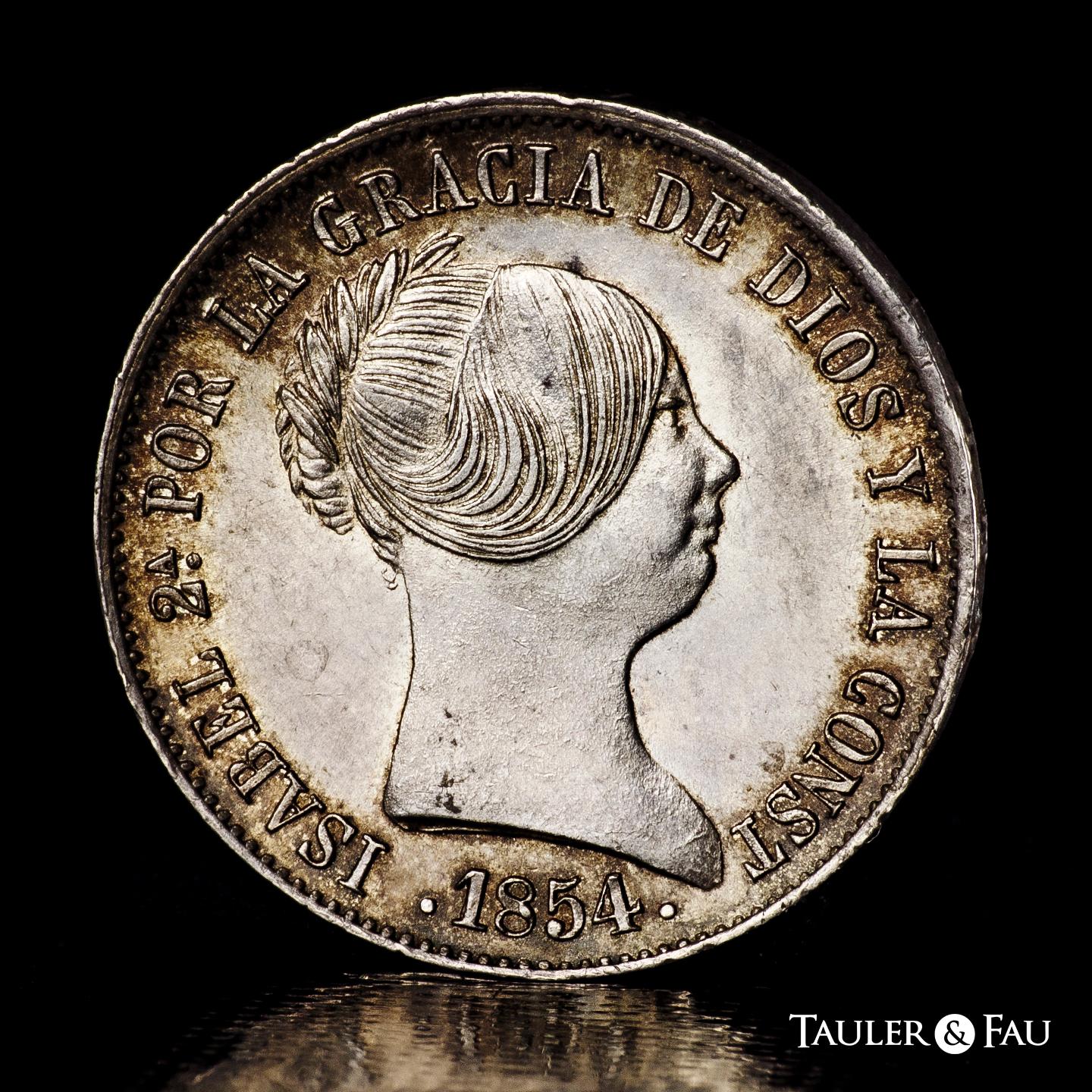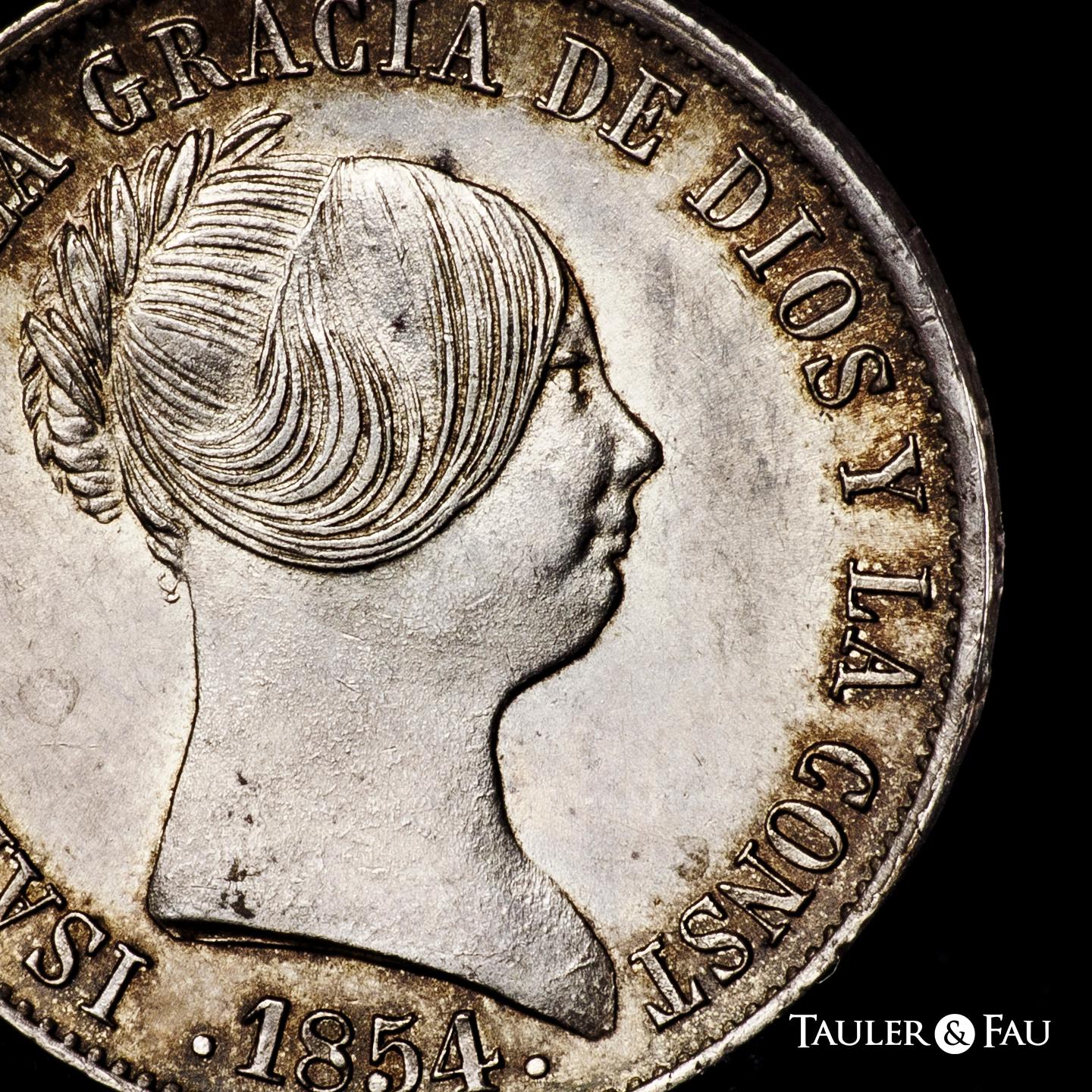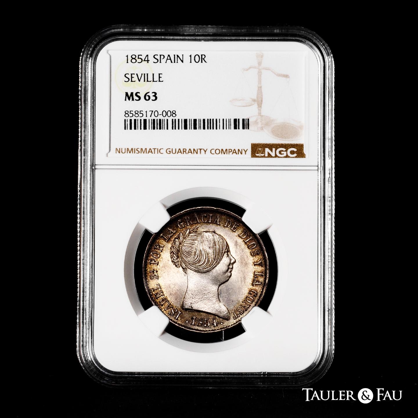 Elizabeth II (1833-1868). 10 reales. 1854. Sevilla. (Cal-551). Ae. 12,91 g. Lovely old cabinet tone with underlying luster. Very rare in this condition. Slabbed by NGC as MS 63. Only 1 finer specimen in the NGC census. Est...400,00.