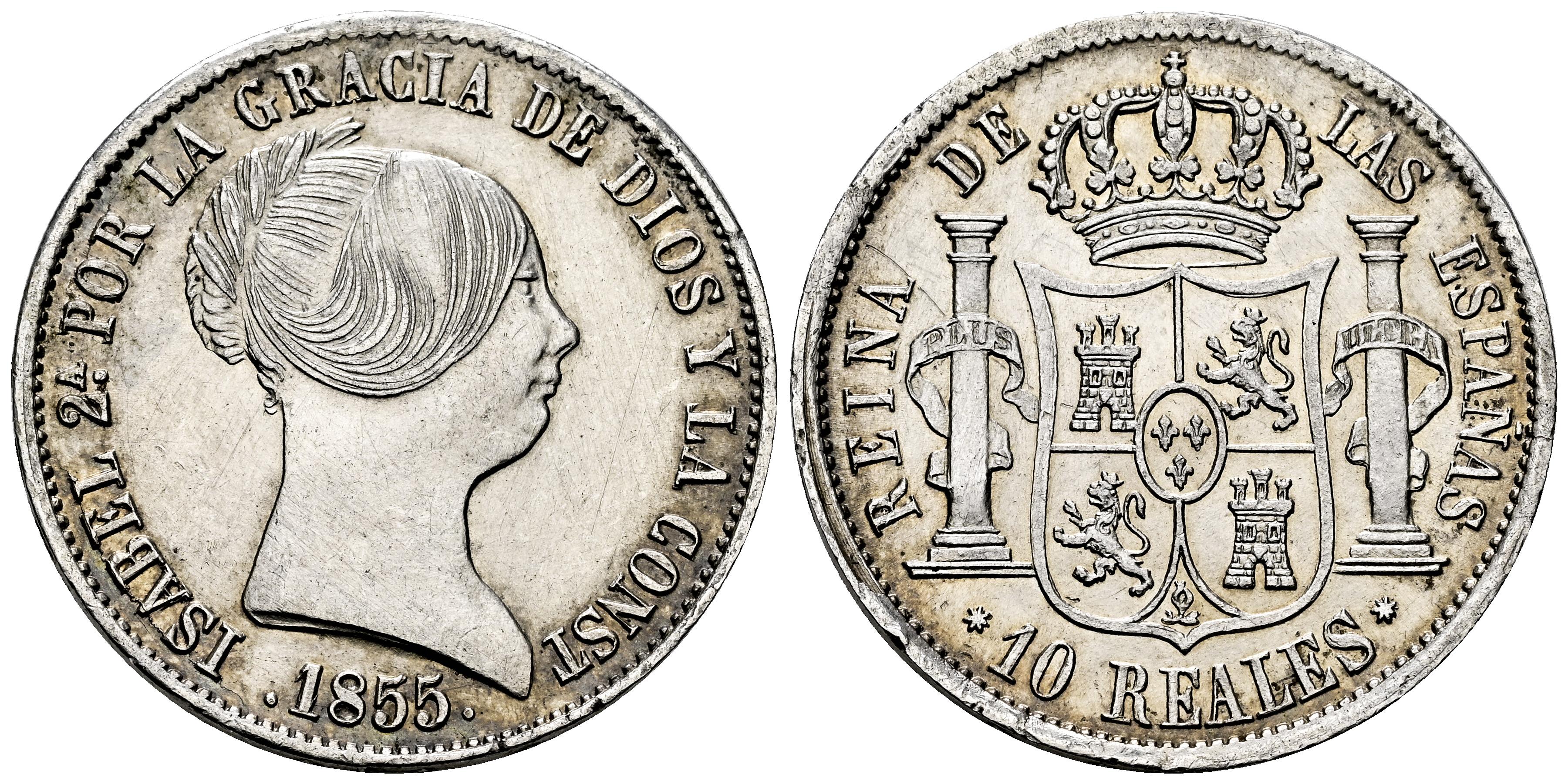 Elizabeth II (1833-1868). 10 reales. 1855. Sevilla. (Cal-552). Ae. 12,90 g. Minor nicks on edge. Slightly cleaned. Scarce. XF. Est...200,00.
