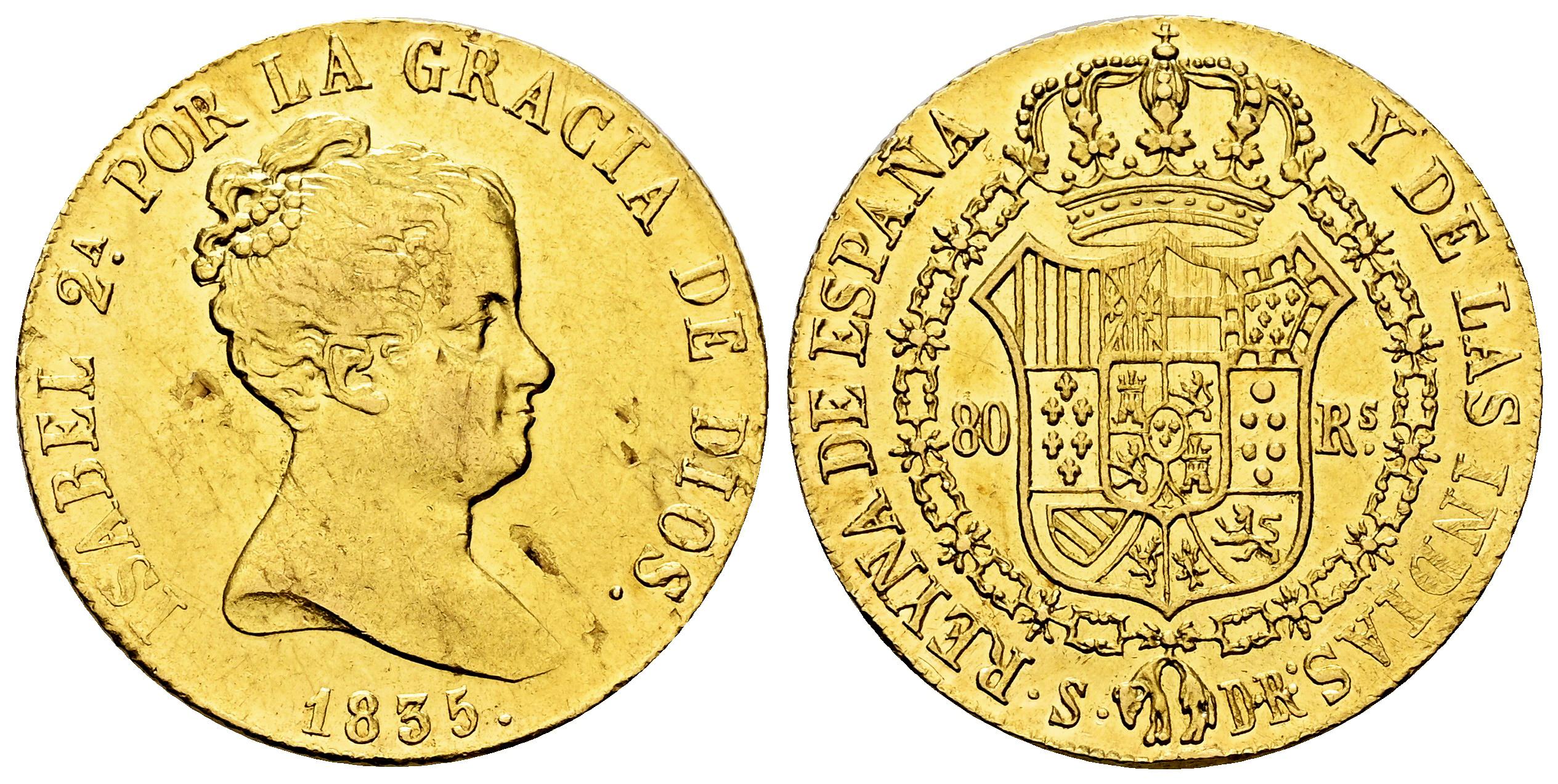 Elizabeth II (1833-1868). 80 reales. 1835. Sevilla. RD. (Cal-737). Au. 6,75 g. Small planchet flaws on obverse. Minor nick on edge. Traces of luster. Rare. Choice VF/XF. Est...600,00.