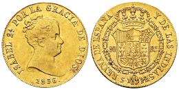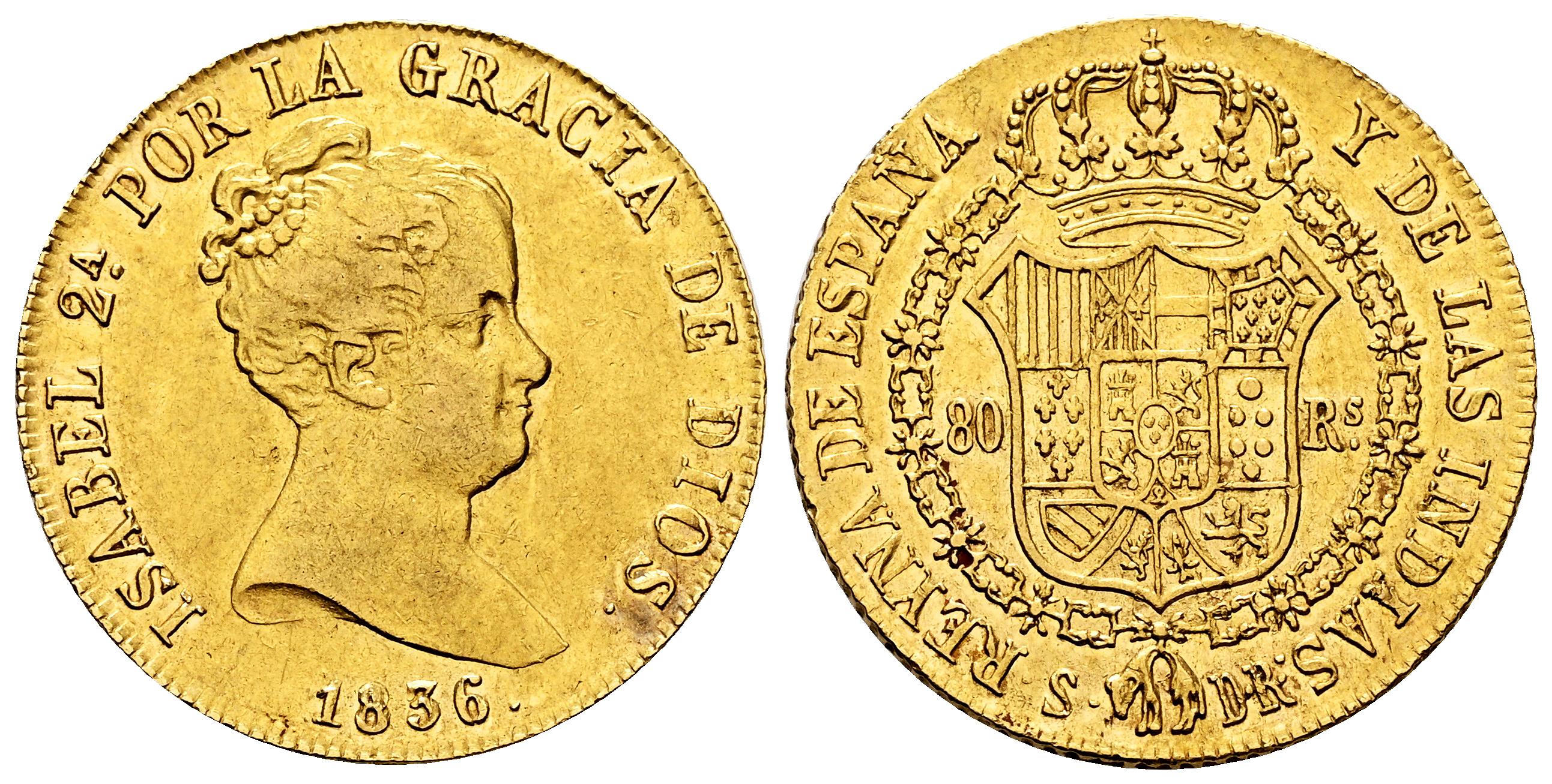 Elizabeth II (1833-1868). 80 reales. 1836. Sevilla. RD. (Cal-738). Au. 6,75 g. Traces of luster. Scarce. Almost XF/XF. Est...600,00.