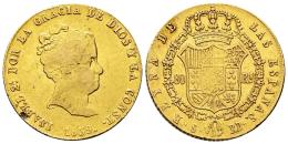 Elizabeth II (1833-1868). 80 reales. 1839. Sevilla. RD. (Cal-743). Au. 6,68 g. Planchet flaws on obverse. Traces of luster. Scarce. Choice VF. Est...600,00.