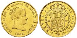 Elizabeth II (1833-1868). 80 reales. 1846. Sevilla. RD. (Cal-752). Au. 6,72 g. Original luster. Minor nick on edge. Scarce in this grade. XF/AU. Est...650,00.