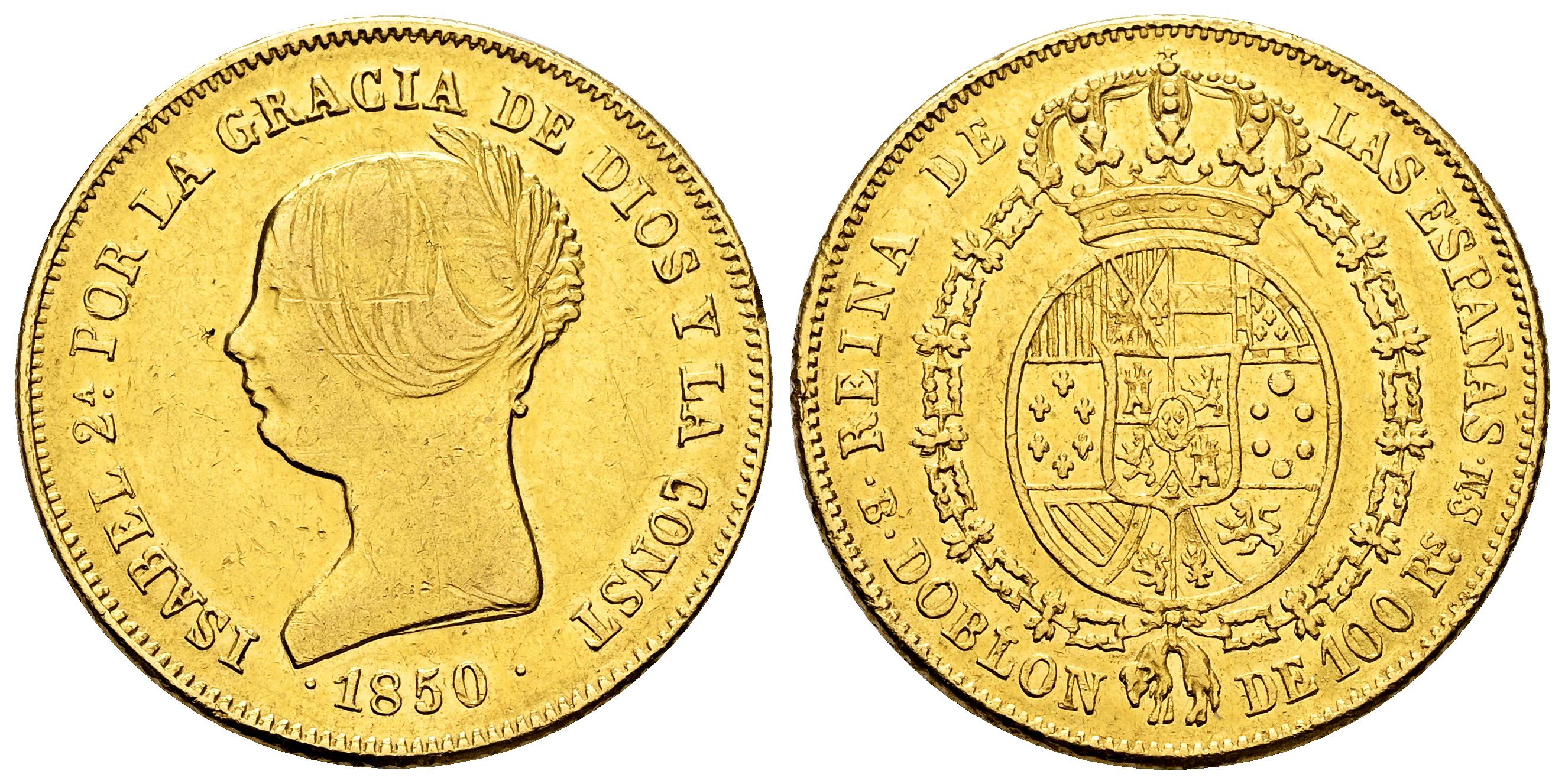 Elizabeth II (1833-1868). Doblon of 100 reales. 1850. Barcelona. SM. (Cal-755). Au. 8,16 g. Minor nick on edge. Traces of luster. Rare. Choice VF/Almost XF. Est...1000,00.