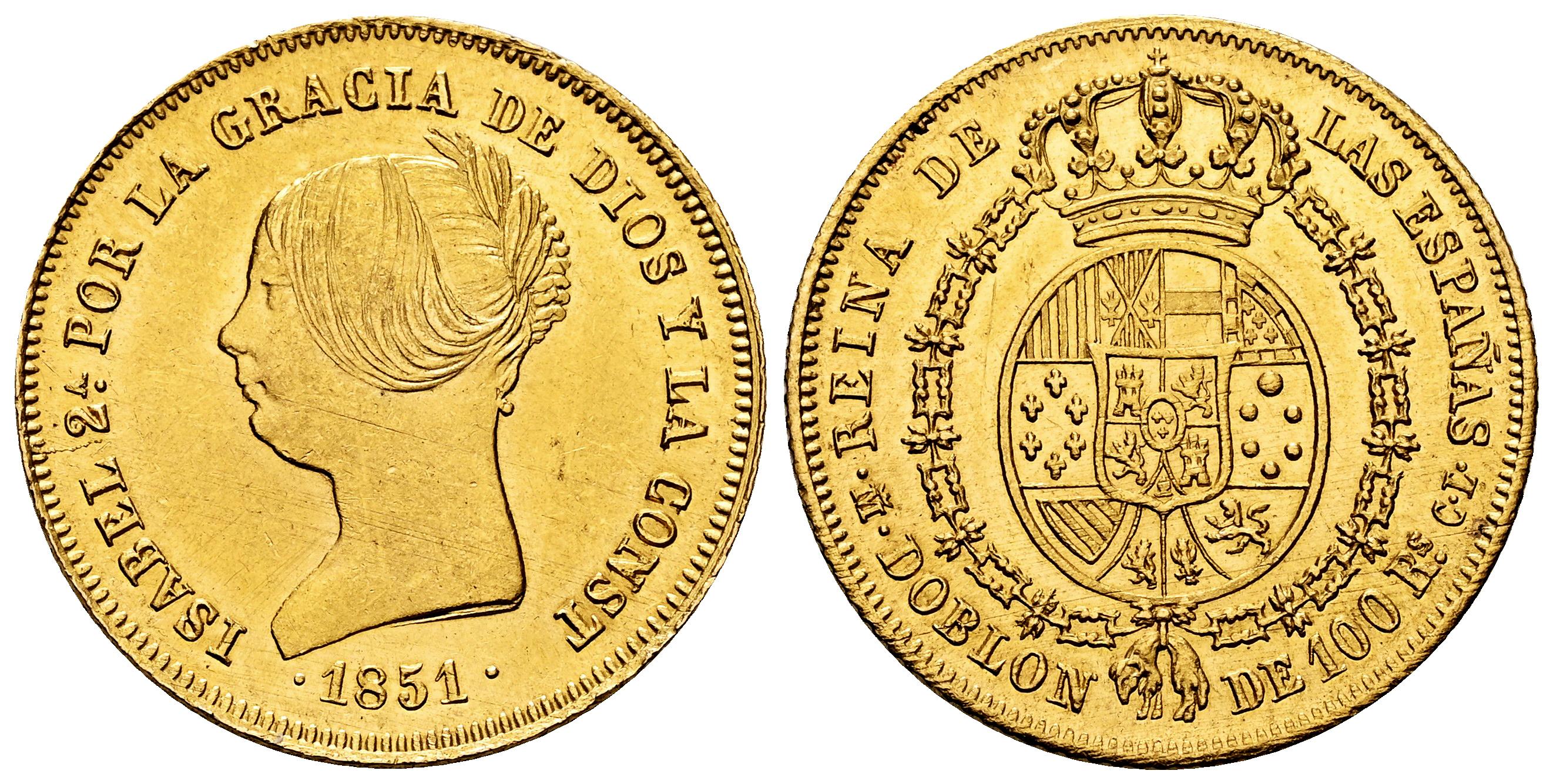 Elizabeth II (1833-1868). Doblon of 100 reales. 1851. Madrid. CL. (Cal-758). Au. 8,17 g. Full luster and very nice color. Minimal hairlines. Rare, even more in this high grade. AU/Almost MS. Est...1000,00.