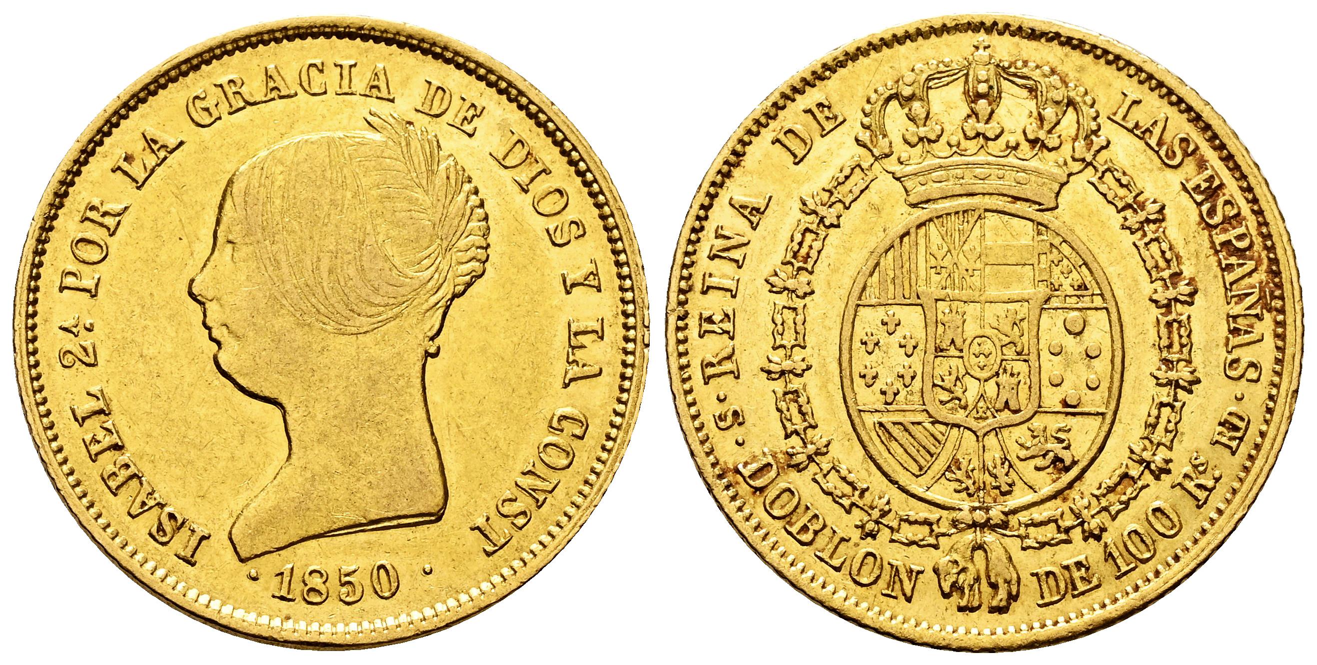 Elizabeth II (1833-1868). Doblon of 100 reales. 1850. Sevilla. RD. (Cal-760). Au. 8,14 g. Traces of luster. Very rare. Choice VF/Almost XF. Est...1000,00.